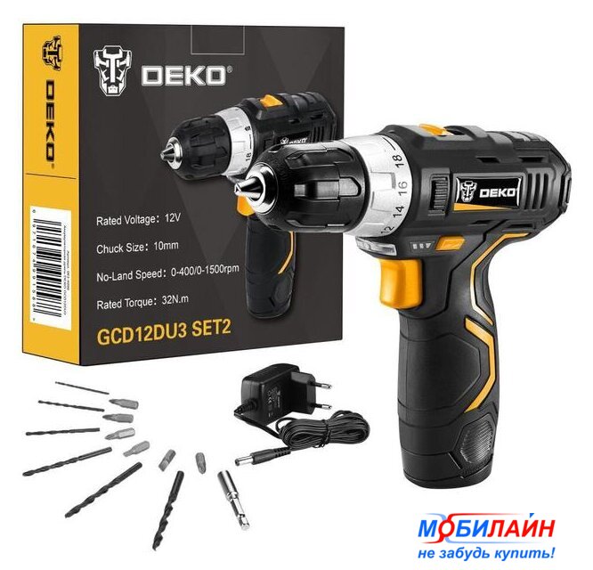 Комплектация | - Дрель-шуруповерт;- Аккумулятор - 1 шт;- Зарядное устройство;- Биты - 6 шт;- Держатель бит - 1 шт;- Сверла - 6 шт;- Инструкция;- Коробка. |