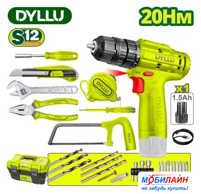 Комплектация | - Аккумуляторная дрель DTCDS510 - 1 шт.- Аккумуляторная батарея 1,5Ач DTLBS515 - 1 шт.- Кабель USB для зарядки - 1 шт.- Отвертка-держатель бит 1/4''x100 мм - 1 шт.- Биты 50 мм (SL4 / SL5 / SL6 / PH1 / PH2 / PH3 / T10 / T15 / T20 / T30) - 10 шт.- Комбинированные плоскогубцы 6'' - 1 шт.- Разводной ключ 6'' - 1 шт.- Индикаторная отвертка 140 мм - 1 шт.- Рулетка 3 м - 1 шт.- Нож с сегментным лезвием 18 мм - 1 шт.- Спиральные сверла 2 / 3 / 4 / 5 / 6 мм - 5 шт.- Сверла по дереву 4 / 5 / 6 / 8 мм - 4 шт.- Винты (ST3.5*10 шт., ST4*10 шт.) - 20 шт.- Пластиковые дюбеля (6 мм*10 шт., 5 мм*10 шт.) - 20 шт.- Ножовки 6'' - 1 шт.- Торцевые насадки 5 / 6 / 7 / 8 / 9 / 10 / 11 мм - 7 шт.- Пластиковый ящик для инструментов 16'' - 1 шт. |