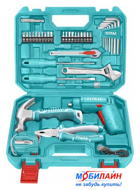 Комплектация | - Отвертка аккумуляторная - 1 шт.- Отвертка SL5.5x100 - 1 шт.- Отвертка PH1x100 - 1 шт.- Комбинированные плоскогубцы 6" - 1 шт.- Разводной ключ 6" - 1 шт.- Мини-молоток - 1 шт.- Индикаторная отвертка (напряжение: 100-500 В переменного тока) - 1 шт.- Рулетка 3 м - 1 шт.- Нож с сегментным лезвием 9 мм - 1 шт.- Бита (SL3, SL4, SL5, SL6, PH0, PH1, PH2, PH3, PZ0, PZ1, PZ2, PZ3, T10, T15, T20, T30, H3, H4, H5, H6) - 20 шт.- Магнитный держатель для бит - 1 шт.- Шестигранный ключ (1,5/2/2,5/3/4/5/5,5/6 мм) - 8 шт.- Кейс |