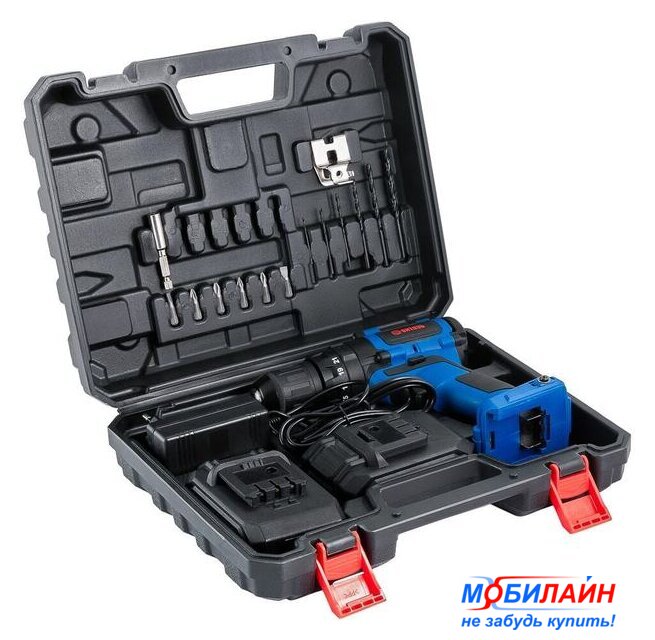 Комплектация | - кейс;- 2 шт аккумулятора;- битодержатель;- набор бит;- набор сверл. |