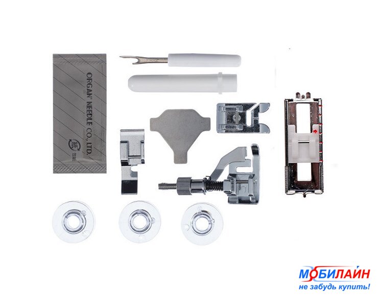 Комплектация | - Универсальная лапка- Лапка для вшивания молнии односторонняя- Рамка для петли-полуавтомат- Лапка для потайной строчки- Отвёртка-ключ- Шпульки пластиковые 4 шт. (3 шт. и 1 в машине)- Набор игл Organ — 3 шт.- Вспарыватель |