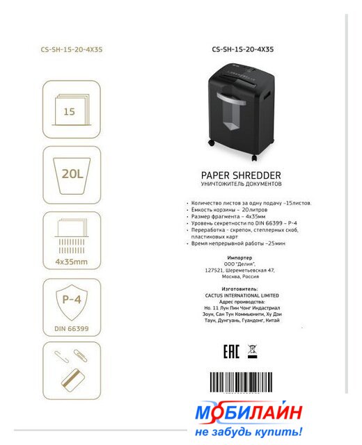 офисный, 4-й уровень секретности, кратковременный режим работы, 58 дБ, корзина: 23 л