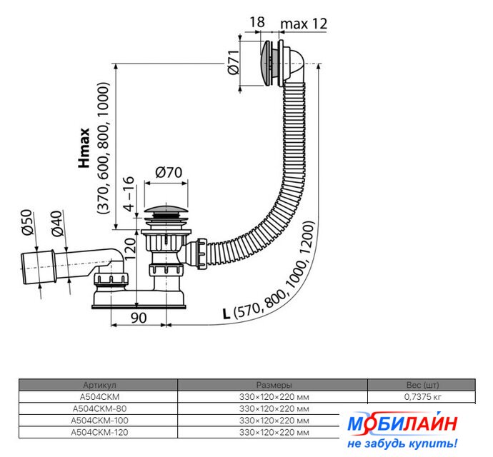 для поддона, полипропилен, резьба 1 1/4", труба 40 мм, гидрозатвор, цвет крышки: белый