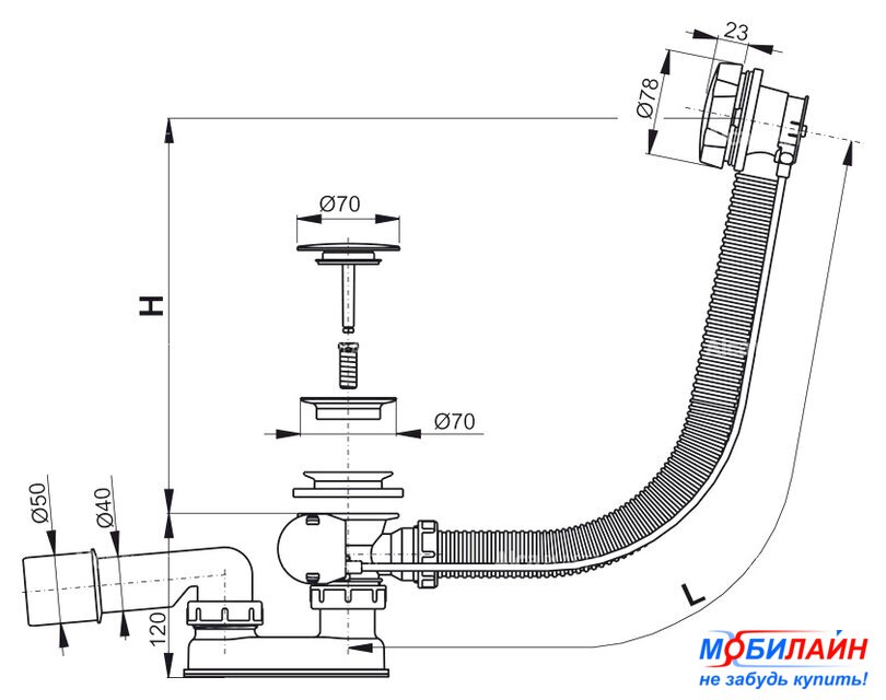 для ванны/для поддона, полипропилен, слив 50 мм, труба 50 мм, гидрозатвор, цвет крышки: белый