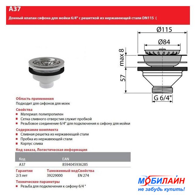 для душа, сталь, слив 50 мм, длина 65 мм, сухой затвор