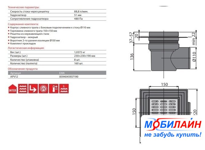 душевой трап, полипропилен, труба 50 мм, сухой затвор, цвет крышки: серый