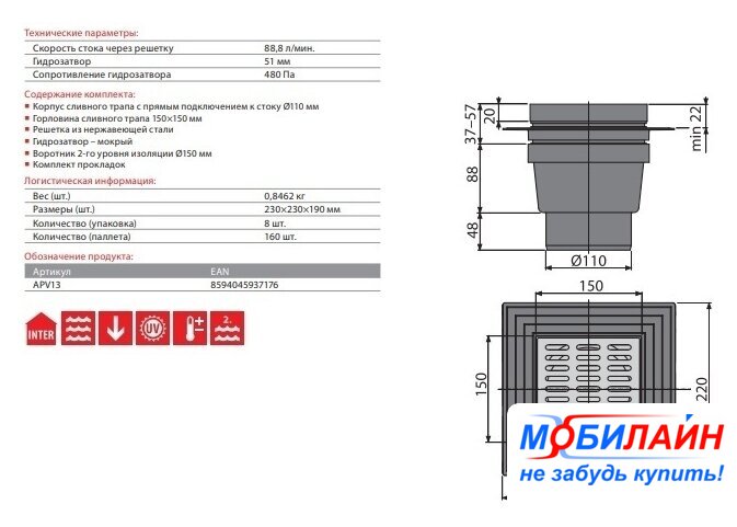 для мойки, полипропилен, труба 40 мм/50 мм, гидрозатвор
