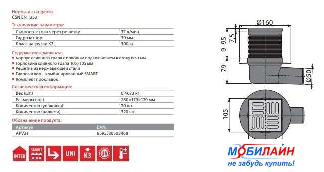 для душа, сталь, слив 50 мм, длина 65 мм, сухой затвор
