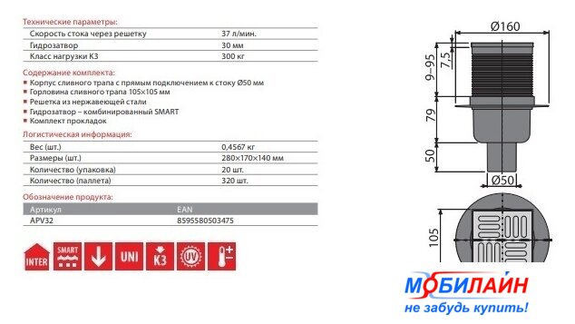 для поддона, полипропилен, слив 90 мм, труба 50 мм, цвет крышки: белый