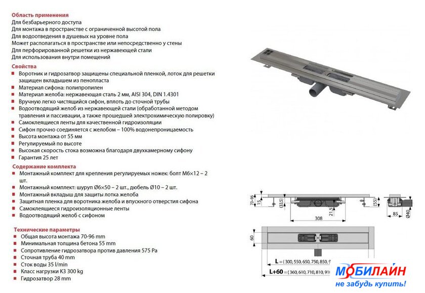для душа, пластик, труба 50 мм, длина 1010 мм, комбинированный, сливная решетка, цвет крышки: нержавеющая сталь