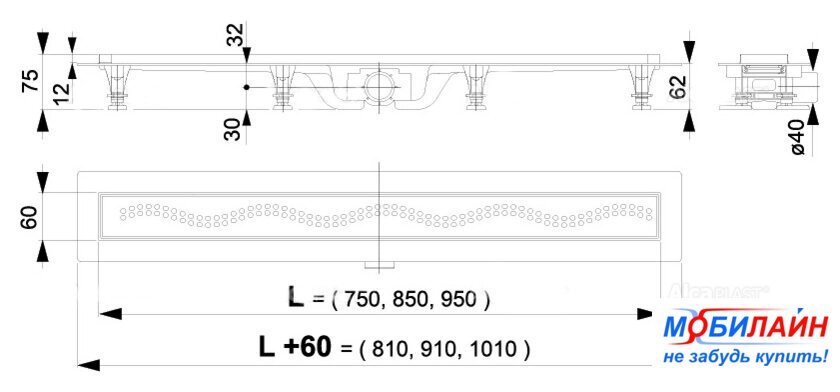 для душа, пластик, труба 40 мм, длина 750 мм, сливная решетка, цвет крышки: нержавеющая сталь