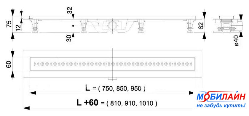 для душа, полипропилен, труба 40 мм, длина 610 мм, комбинированный, сливная решетка, цвет крышки: нержавеющая сталь