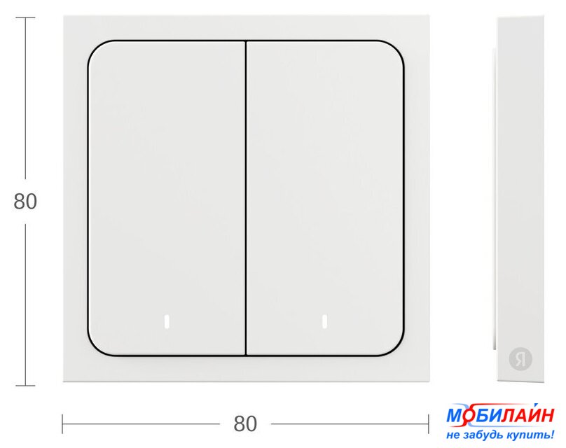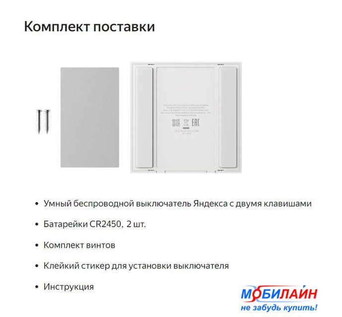 Комплектация | Умный беспроводной выключатель Яндекса с двумя клавишамиБатарейки CR2450, 2 шт.Комплект винтовКлейкий стикер для установки выключателяИнструкция |
