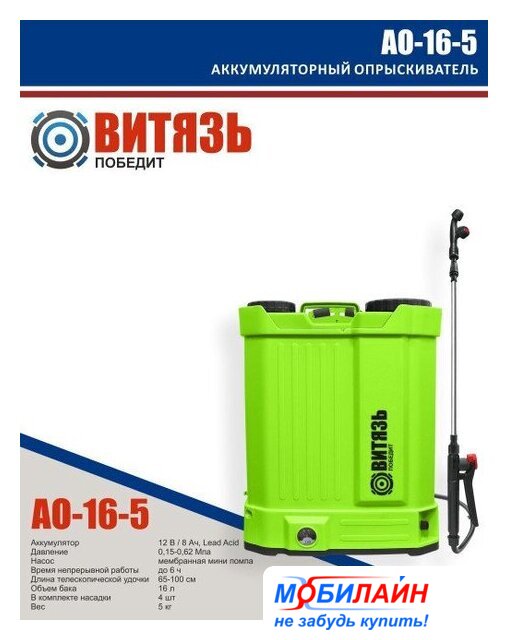 аккумуляторный, 10 л, 6 бар, телескопическая штанга, зеленый, 4.3 кг