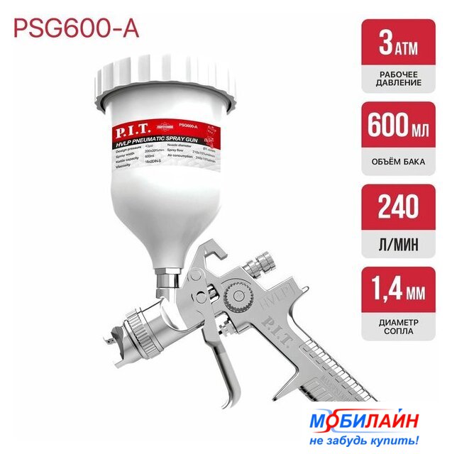 HVLP, расход воздуха: 198 л/мин, 3 бар, сопло: 1.4 мм, бачок: 600 мл, 1000 г