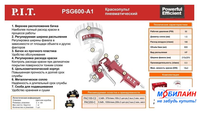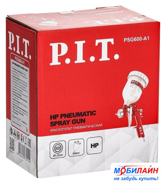HP, расход воздуха: 200 л/мин, 3 бар, сопло: 1.5 мм, бачок: 1000 мл, 800 г