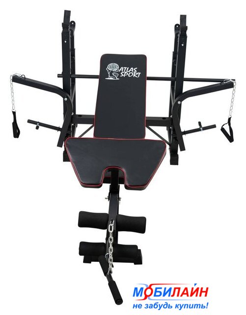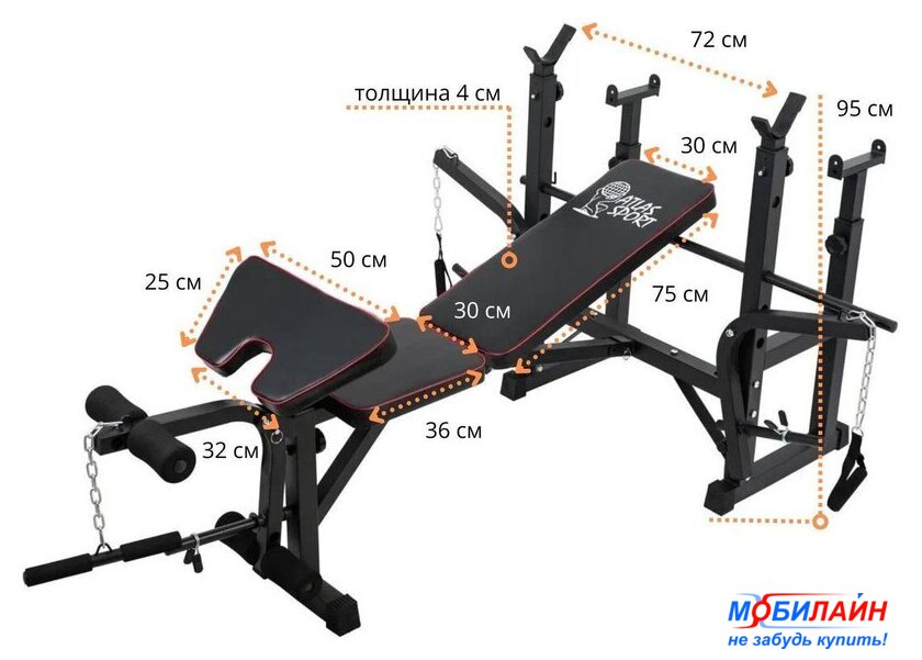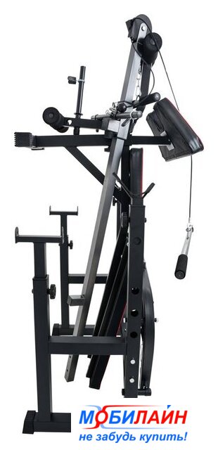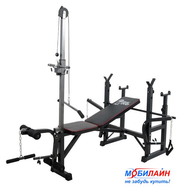 Конструкция | стойка для штанги, скамья для жима штанги, парта Скотта, механизм для баттерфляя, блок для ног, верхняя тяга |