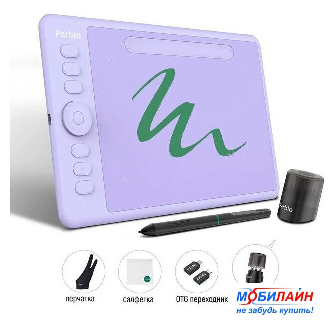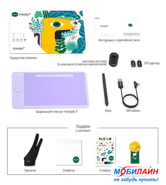 Комплект поставки | − графический планшет Intangbo S− пассивное цифровое перо P08− подставка для пера− 8 запасных наконечников для пера− кабель USB Type-C− два адаптера OTG для смартфонов (Micro-USB и USB Type-C)− перчатка− ткань для чистки− инструкция пользователя− гарантийный талон |