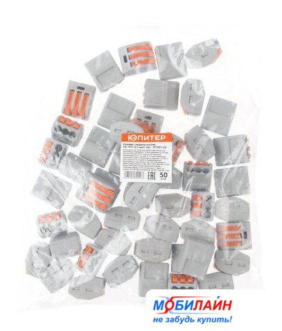 ном. напряжение 380 В, ном. ток 32 А, корпус: полиэтилен, соединение: пружинный зажим, 4 точки, сечение одножильных проводников 0.1-2.5 кв.мм, сечение многожильных проводников 0.08-4 кв.мм, 50 шт. в наборе, цвет: белый/оранжевый