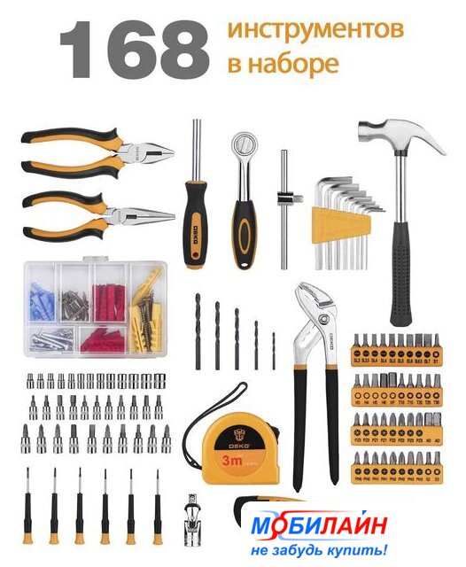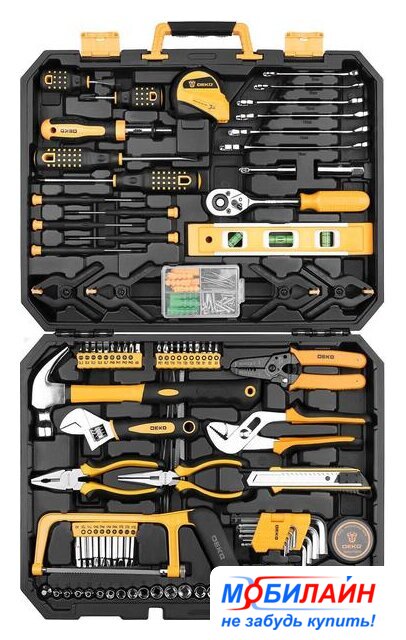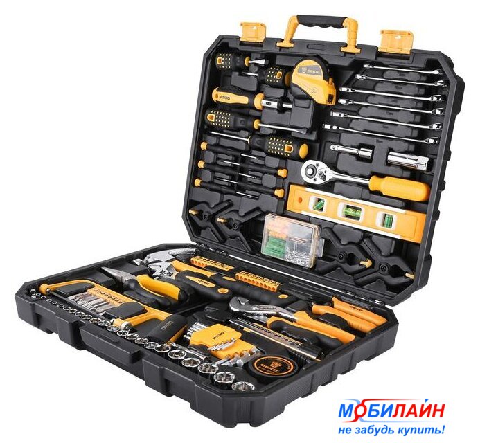 | Комплектация | - Рулетка 3 м;- Отвертка для бит с трещоткой 6.35 мм;- Отвертки PH2Х38, 2Х100 мм., SL 6х38, 6х100 мм;- Отвертки точечные PH0, 00, 000; SL 2.4, 3 мм;- Зажим нейлоновый 3";- Комбинированные ключи 8, 10, 12, 13, 14, 15 мм;- Уровень 25 мм;- Трещотка 3/8";- Удлинитель торцевых головок 3/8"х3";- Головки свечные 3/8"х16 мм;- Головки 1/4": 4, 4.5, 5, 5.5, 6, 7, 8, 9, 10, 1, 12, 13 мм; 3/8": 10, 11, 12, 13, 14, 15, 16, 17, 18, 19 мм;- Переходник для головок торцевых: 1/4"х3/8";- Биты SL3, 4, 5, 6, 7; PH0, 1, 2, 3; PZ1, 2; Т10, 15, 20, 25, 30; S1, 2, 3; AD;- Биты 1/4" 15 мм: SL4, 5, 6; PH0, 1, 2, 3; T15, 20; AD;- Разводной ключ 8";- Разводной ключ 45 градусов 8";- Пассатижи 6";- Длинногубцы 6";- Молоток 0.2 кг;- Инструмент для зачистки проводов 7";- Пила 6";- Сменные полотна для пилы 2 шт;- Хомуты пластиковые 5 шт;- Ключи шестигранные: 1.5, 2, 2.5, 3, 4, 5, 6, 8, 10 мм;- Нож строительный 18 мм;- Изоляционная лента 5 м;- Шестигранный адаптер 60 мм;- Набор дюбелей и саморезов 71 шт. |