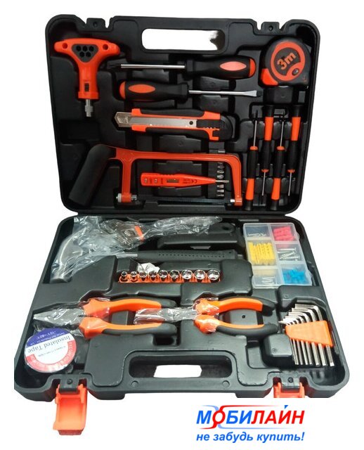 Комплектация | Длинногубцы 6" - 1штНабор ключей шестигранников - 8штМолоток-1 штОтвертка 2штОтвертка для точных работ - 4 штИндикаторная отвертка -пробник 1штИзолента 1штРулетка 3м-1штМонтажный нож-1штТорцевые головки 1/4-9штОтвертка-битодержатель -1штНабор бит 25мм 9штБита - адаптер для торцевых головок 1штНабор крепежа 1штКейс 1штНожовка по металлу- 1штплоскогубцы 6" 1шт |