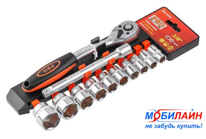 Комплектация | Головка торцевая 3/8": 10, 11, 12, 13, 14, 15, 17, 19, 22, 24 мм;Трещотка 3/8";Удлинитель 3/8" 150 мм |