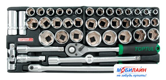 Комплектация | - 1/2" Головки торцевые шестигранные 8, 10, 11, 12, 13, 14, 15, 16, 17, 18, 19, 21, 22, 23, 24, 26, 27, 29, 30, 32 мм- 1/2" Головки торцевые шестигранные, дюймовые 3/8", 7/16", 1/2", 9/16", 5/8", 11/16", 3/4", 13/16", 7/8", 15/16", 1", 1-1/16", 1-1/8", 1-1/4"- 1/2" Головки свечные магнитные 16 мм и 21 мм- 1/2" Трещотка реверсивная быстросъемная- 1/2" Удлинитель 75 мм, 125 мм, 250 мм- 3/8" x 1/2" Переходник- 1/2" Вороток с шарниром- 1/2" Кардан |