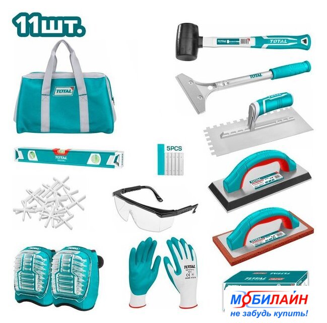| Комплектация | - Киянка резиновая 230 г - 1 шт.- Металлический скребок с 5 ножами SK5 - 1 шт.- Штукатурный шпатель 280x130 мм с зубцами - 1 шт.- Терка с резиновой губкой 240x100 мм - 1 шт.- Терка с резиновым покрытием 230x100 мм - 1 шт.- Уровень 40 см - 1 шт.- Защитные очки - 1 шт.- Нитриловые перчатки - 1 пара- Наколенники - 1 пара- Крестики для плитки - 250 шт.- Холщовая сумка 400 мм |