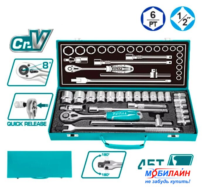 | Комплектация | Трещотка 1/2" 45T - 1 шт.Тоцевые головоки 1/2" (10, 11, 12, 13, 14, 15, 16, 17, 18, 19, 20, 21, 22, 23, 24, 27, 30, 32 мм) - 18 шт.Универсальный шарнир 1/2 дюйма - 1 шт.Удлинитель 1/2" (125 мм) - 1 шт.Удлинитель 1/2" (250 мм) - 1 шт.Вороток T-образный с бегунком 1/2" (250 мм) - 1 шт.Рукоятка с шарниром 1/2" (375 мм) - 1 шт.Кейс |