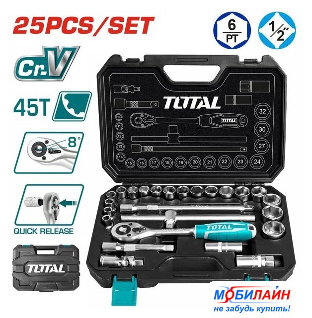 | Комплектация | Трещотка 1/2" 45T - 1 шт.Тоцевые головоки 1/2" (10, 11, 12, 13, 14, 15, 16, 17, 18, 19, 20, 21, 22, 23, 24, 27, 30, 32 мм) - 18 шт.Свечные головки 1/2" (16 мм и 21 мм) - 2 шт.Универсальный шарнир 1/2 дюйма - 1 шт.Удлинитель 1/2" (125 мм) - 1 шт.Удлинитель 1/2" (250 мм) - 1 шт.Вороток T-образный с бегунком 1/2" (250 мм) - 1 шт.Кейс |
