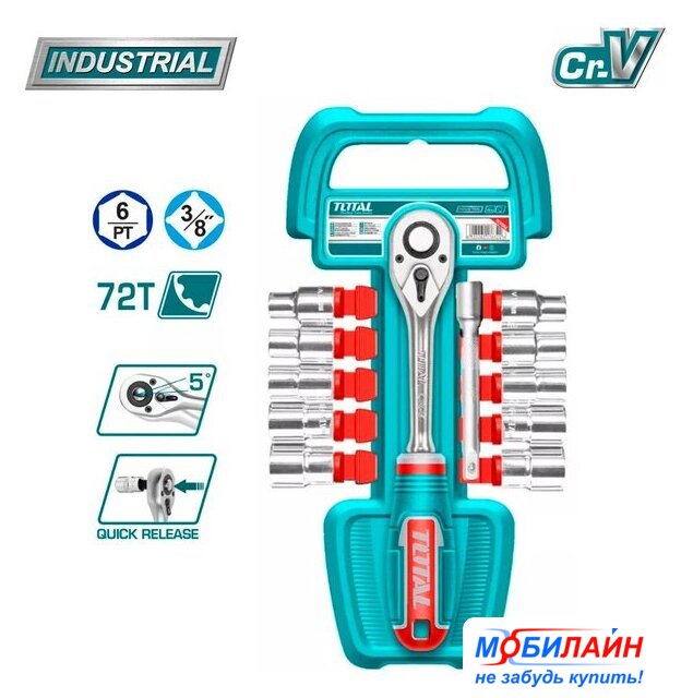 | Комплектация | Трещотка 72T 3/8" - 1 шт. Торцевые головоки 3/8" (8 / 10 / 11 / 12 / 13 / 14 / 15 / 16 / 17 / 19) - 12 шт. Удлинитель 3/8" (150 мм) - 1 шт. Пластиковый подвес для хранения |