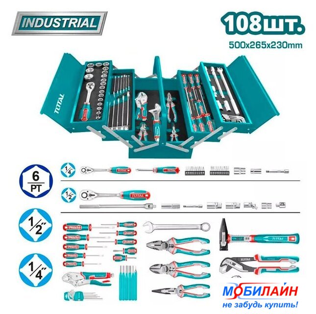 | Комплектация | Ключи и головки (1/4" дюйма): Трещоточный ключ 1/4" - 1 шт. Головки 1/4": 4, 4.5, 5, 5.5, 6, 7, 8, 9, 10, 11, 12, 13, 14 мм - 13 шт. Удлинители 1/4": 50 мм и 100 мм - по 1 шт. Вороток 1/4" x 150 мм - 1 шт. Держатель бит 1/4" → 6.35 мм - 1 шт. Биты для отверток - 20 шт. Плоские (SL): SL3, SL4, SL5, SL6. Крестовые (PH): PH0, PH1, PH2, PH3. Улучшенные крестовые (PZ): PZ0, PZ1, PZ2, PZ3. Звездообразные (Torx): T10, T15, T20, T30. Шестигранные (Hex): H3, H4, H5, H6.Ключи и головки (1/2" дюйма): Трещоточный ключ 1/2" - 1 шт. Карданный шарнир 1/2" - 1 шт. Головки 1/2": 10, 11, 12, 13, 14, 15, 16, 17, 18, 19, 20, 21, 22, 23, 24, 27, 30, 32 мм - 18 шт. Свечные головки 1/2": 16 мм и 21 мм - по 1 шт. Удлинители 1/2": 125 мм и 250 мм - по 1 шт. Гибкая рукоятка 1/2" x 375 мм - 1 шт. Трехсторонний переходник 1/2" → 3/8" - 1 шт.Отвертки: Плоские (SL): 3x75 мм, 4x100 мм, 5.5x100 мм, 6.5x38 мм, 6.5x125 мм, 8x150 мм. Крестовые (PH): PH1x75 мм, PH2x125 мм, PH2x38 мм, PH3x200 мм.Гаечные ключи: Накидные/рожковые ключи: 8, 10, 11, 12, 13, 14, 15, 16, 17, 18, 19, 22 мм - 12 шт. Шестигранные ключи: 1.5, 2, 2.5, 3, 4, 5, 6, 8, 10 мм - 9 шт.Плоскогубцы и кусачки: Ключ разводной 10" - 1 шт. Ключ трубный 10" - 1 шт. Длинногубцы 6" - 1 шт. Комбинированные плоскогубцы 8" - 1 шт. Бокорезы 7" - 1 шт. Клещи с изогнутыми губками 10" - 1 шт.Прочие инструменты: Молоток слесарный 300 г - 1 шт. Выколотки: 1.5x152 мм, 3x152 мм, 4x152 мм, 5x152 мм, 6x152 мм, 8x152 мм - 6 шт. |