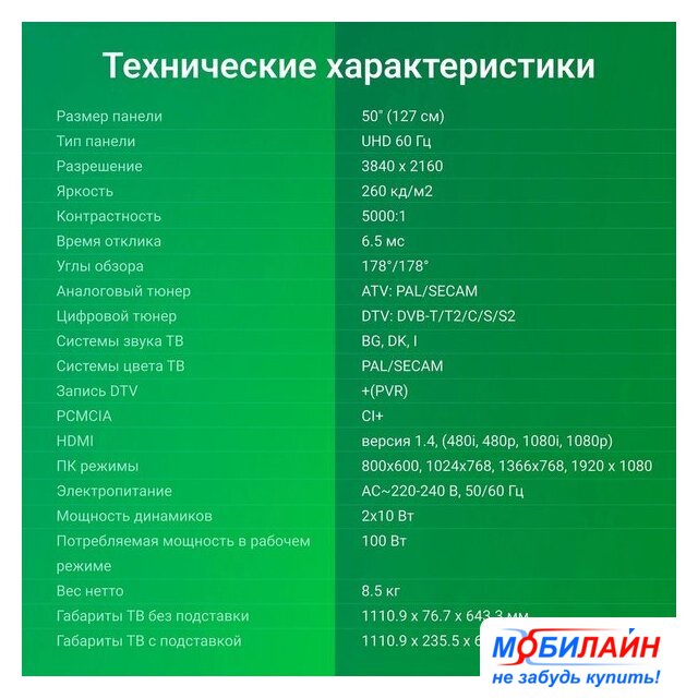 | Диагональ экрана | 50" |