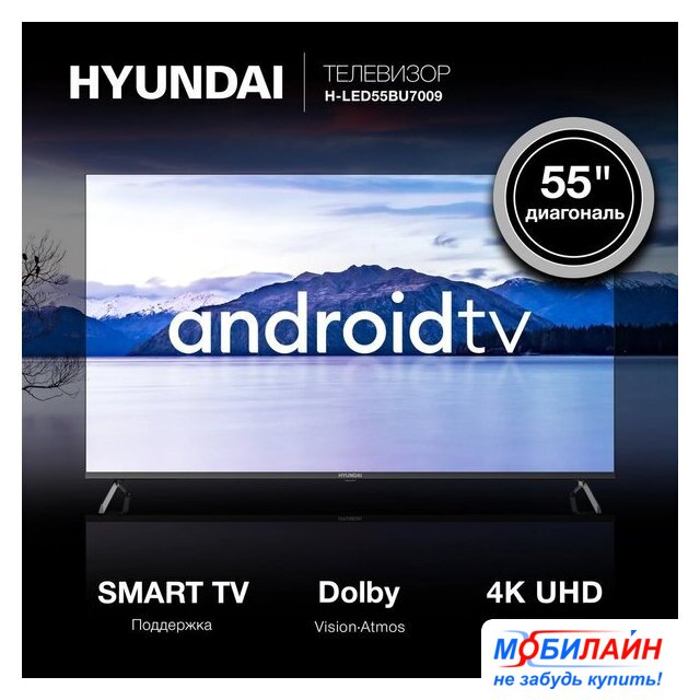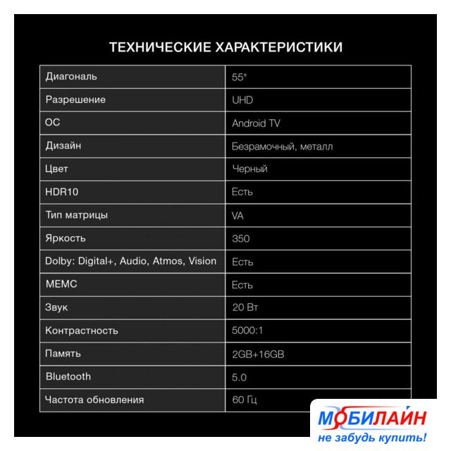 55" 3840x2160 (4K UHD), матрица VA, частота матрицы 60 Гц, Smart TV (Android), HDR10, HDR10+, Dolby Vision, Dolby Atmos, Wi-Fi, смарт пульт