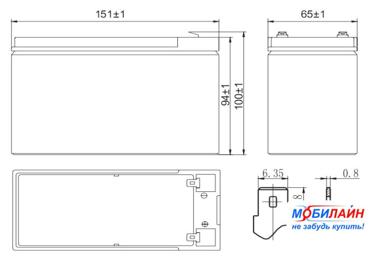 AGM, 12 В, 6 А·ч, макс. ток 90 А, клеммы F2, 151x52x94 мм, 2.18 кг, срок службы: 8 лет