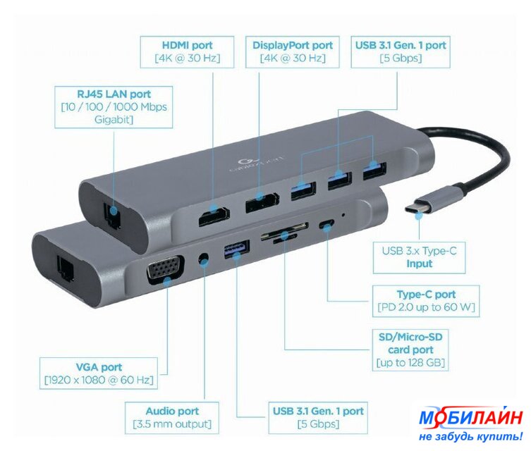 USB Type-A 3.2 Gen1 (5 Гбит/с)/USB Type-C/HDMI/3.5 мм jack, 4 порта, 3x USB Type-A 3.2 Gen1, 1x USB 3.2 Gen1 Type-C, пассивное питание, картридер SD/SDHC/SDXC/microSD/microSDHC/microSDXC/MMC, цвет серый