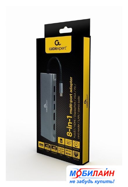подключение по USB-C, 4 x USB-A, 1 x USB-C, видео до 4K 30 Гц, питание USB-C PD до 87 Вт, LAN-адаптер 100 Мбит/с, кардридер, корпус металл