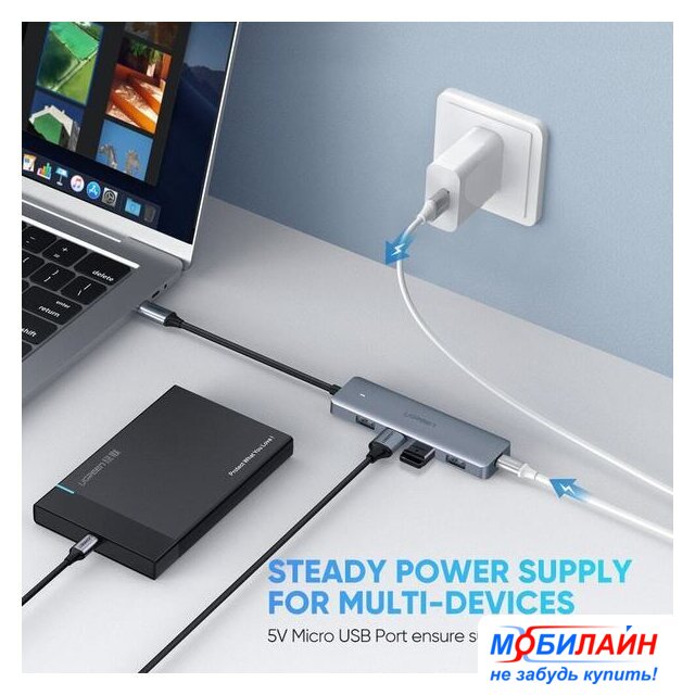 USB 3.0/USB Type-C/HDMI, 6 портов, пассивное питание, цвет серый