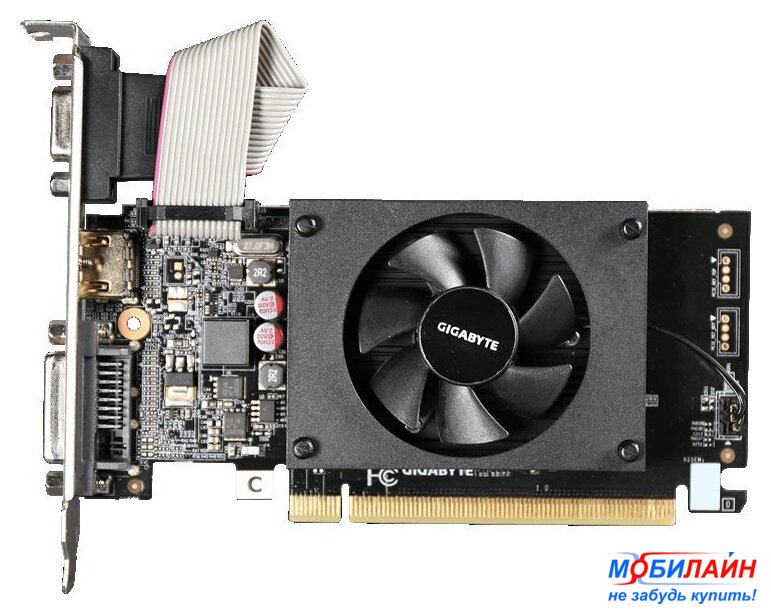 NVIDIA GeForce GT 710, базовая частота 954 МГц, 192sp, частота памяти 1600 МГц, 64 бит, доп. питание: нет, 2 слота, VGA, DVI, HDMI