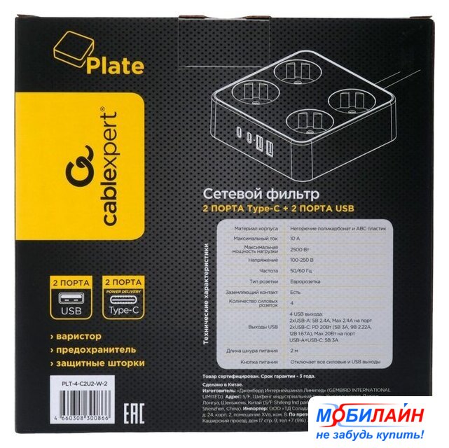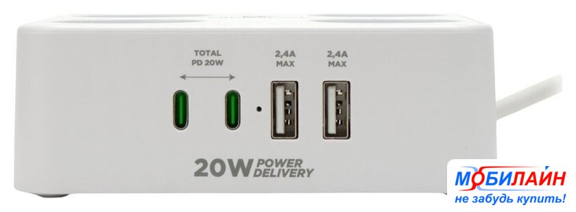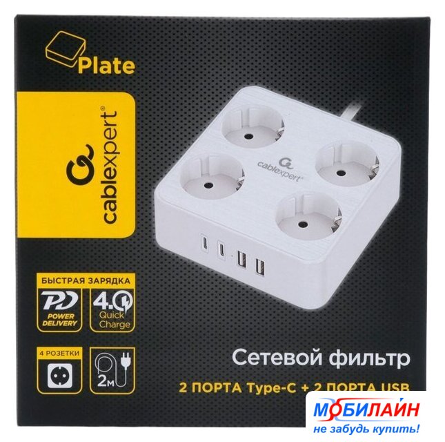 сетевой фильтр, кабель 2 м, 4 розетки Schuko (евро с заземлением) / 2500 Вт/USB
