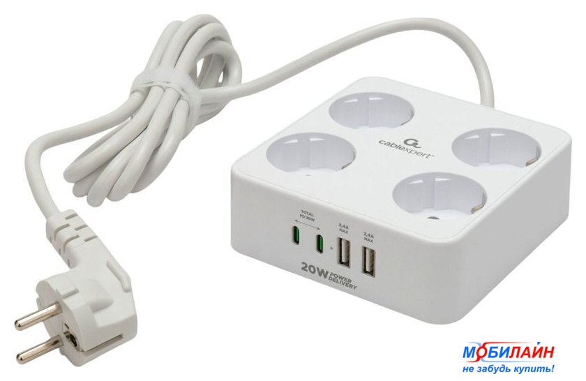 сетевой фильтр, кабель 3 м, 4 розетки Schuko (евро с заземлением) / 2500 Вт/USB