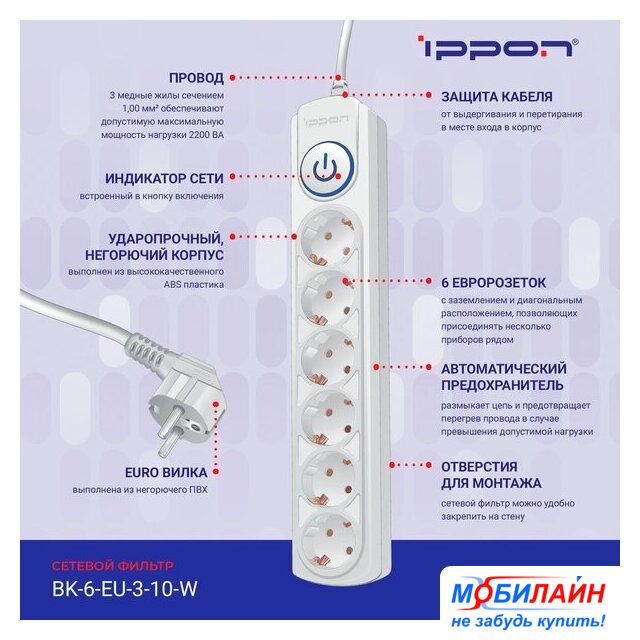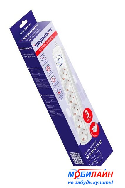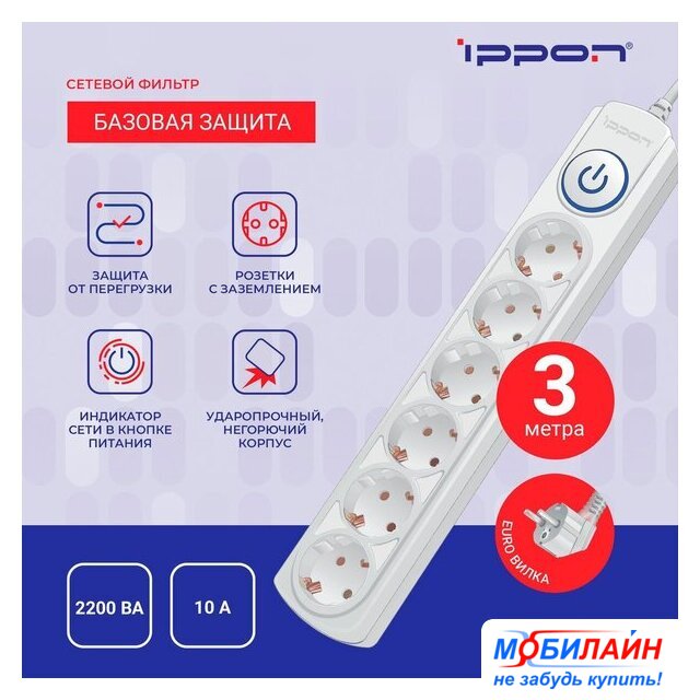 сетевой фильтр, кабель 3 м, 6 розеток Schuko (евро с заземлением), 2200 VA