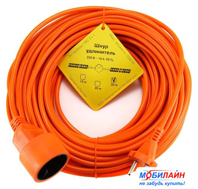 удлинитель, 30 м, 1 розетка евро без заземления / 2200 Вт