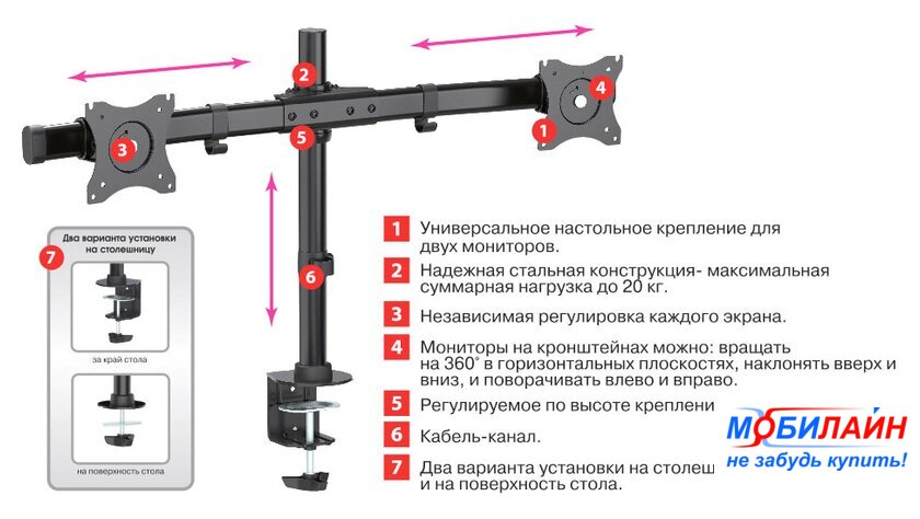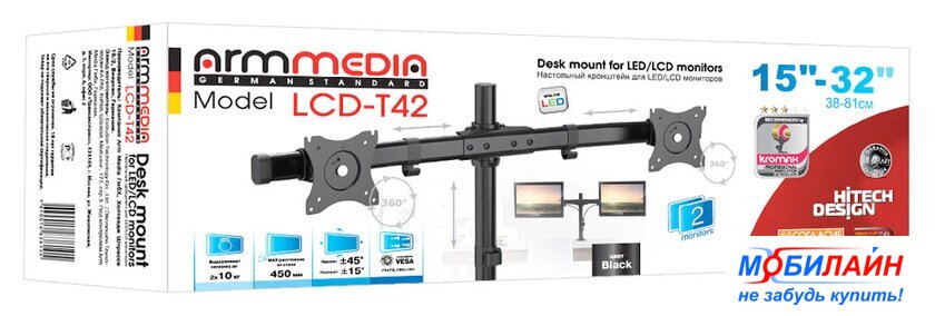 настольный кронштейн для ЖК-монитора 13-32", наклон 35°, поворот 180°, цвет черный