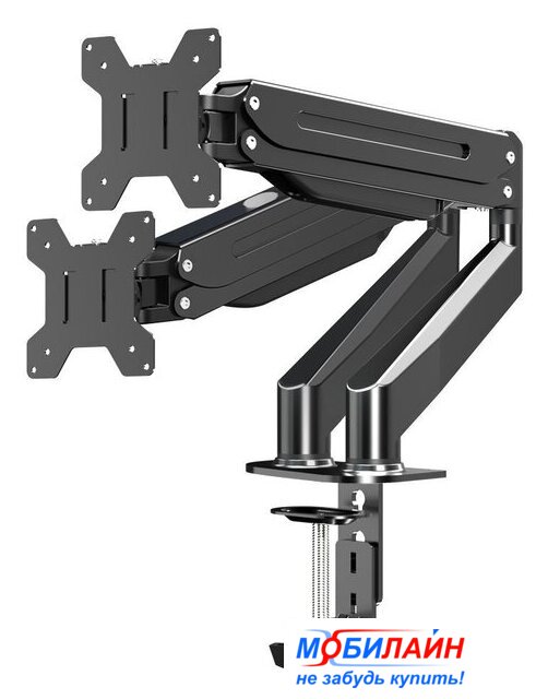 кронштейн для монитора, 15-32", 2 монитора, к столешнице, с регулировкой поворота, с регулировкой высоты, с кабель-каналом, струбцинное крепление, наклон -45-90°, поворот -90-90°, регулировка высоты 125-425 мм, цвет черный