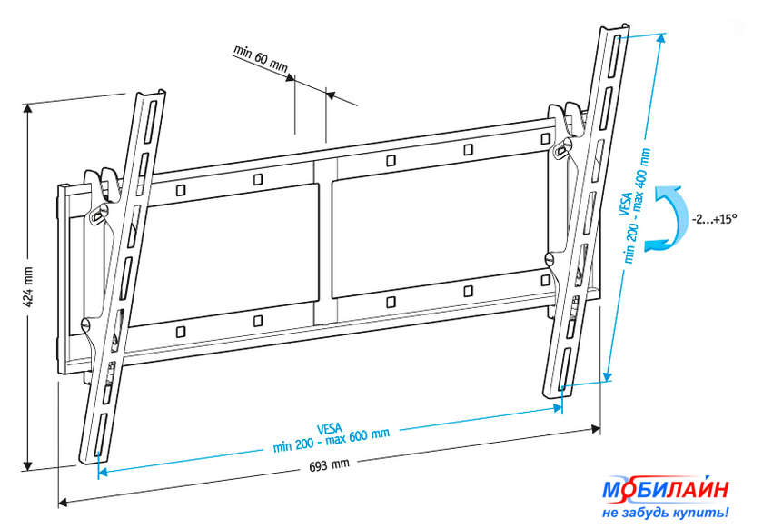 настенный кронштейн для ЖК-телевизора 32-55", наклон 15°, поворот 90°, цвет черный
