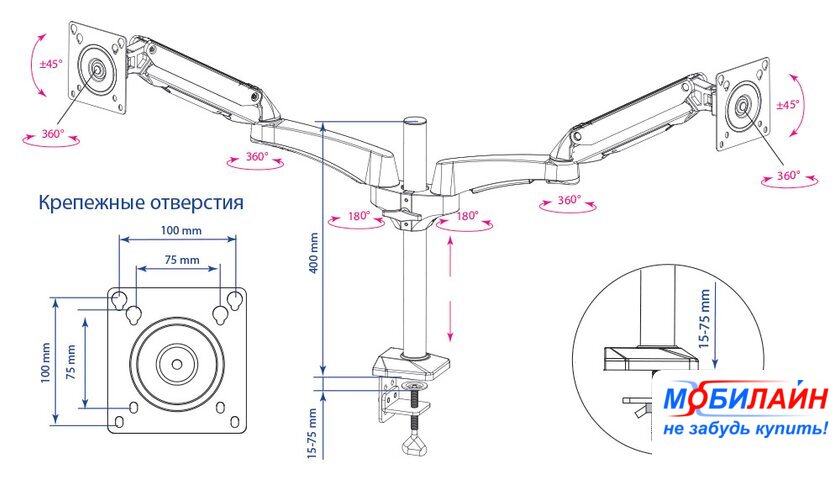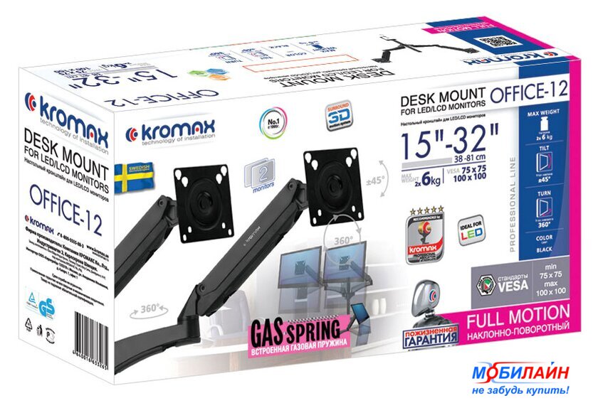 Максимальная нагрузка | 12 кг (по 6 на каждый монитор) |