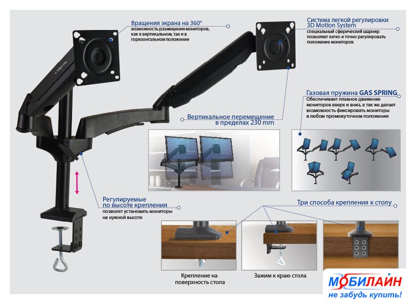 настольный кронштейн для ЖК-монитора 13-27", наклон 90°, поворот 180°, цвет черный