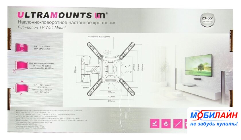 настенный кронштейн для ЖК-телевизора 23-55", наклон 20°, поворот 90°, цвет черный