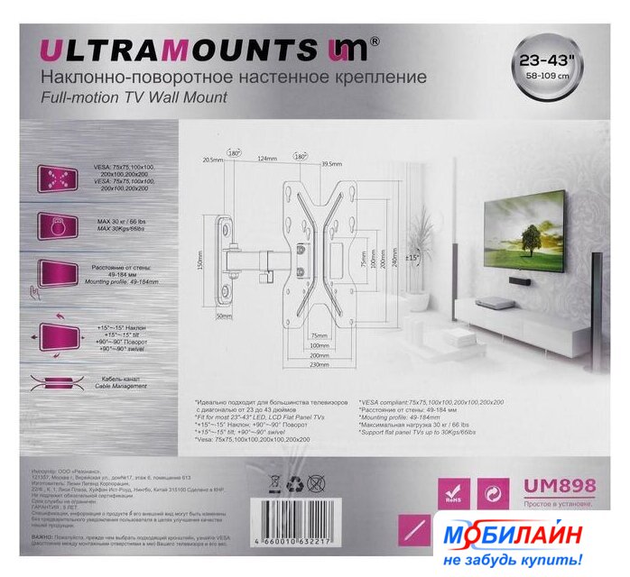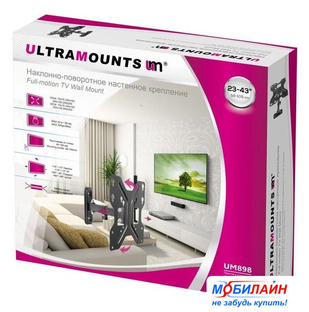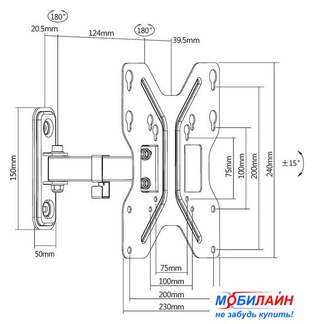 настенный кронштейн для ЖК-телевизора 20-43", наклон 12°, поворот 180°, цвет черный